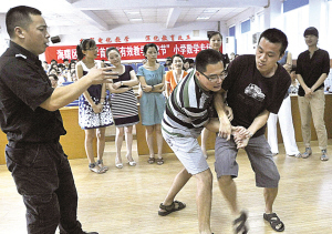 新学期第一天,海曙中心小学举行“学生安全应急处置”讲座。请来特警对全体教师进行安全培训,指导老师合理处置突发事件,正确使用防护用具,以营造平安校园。(胡建造 许玉芬 摄)