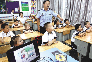 昨日下午,海曙交警大队一位民警在范桂馥小学向一年级新生播放交通安全动漫片。连日来,海曙交警巡回于辖区内各小学和幼儿园,用生动活泼的形式向他们讲解交通安全知识。