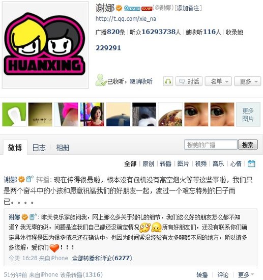 微讯:谢娜微博澄清婚礼细节 坦言行程未定