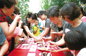 近日,江北区甬江街道湖西社区举行“情满邻里,互助互爱”首届邻里节暨金领汇全民健身万里行进社区活动。当天,全体社区居民签署《邻里和睦公约》,品尝中秋百家宴,拍摄社区全家福。图为社区居民正在品尝中秋百家宴。
