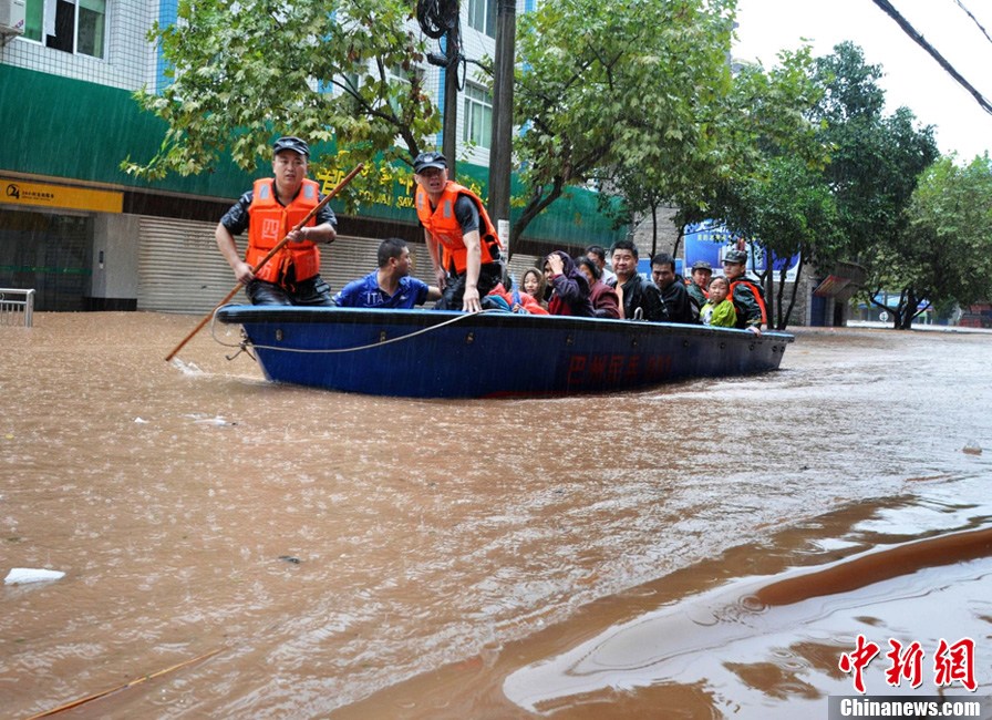 9月18日,四川巴中市境内普降暴雨,造成了巴河水位上涨约10米,超过警戒水位。巴州区曾口镇洪水漫过街道,造成大量民众被困,受灾严重。截止18日晚间19时许,巴中市消防、民兵、武警等已出动警力上千人次,冲锋舟50艘次,营救被困群众600余人,疏散转移民众千余人。图为救援官兵冒雨转移被困民众。中新社发 曹双友 摄