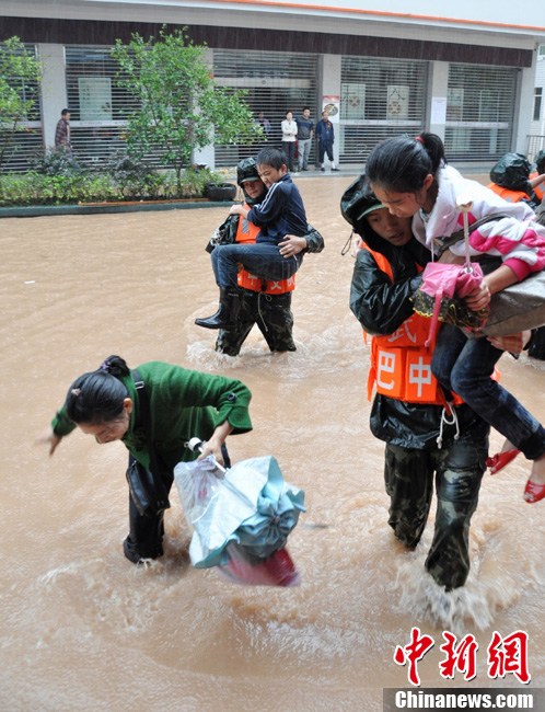 9月18日,四川巴中市境内普降暴雨,造成了巴河水位上涨约10米,超过警戒水位。巴州区曾口镇洪水漫过街道,造成大量民众被困,受灾严重。截止18日晚间19时许,巴中市消防、民兵、武警等已出动警力上千人次,冲锋舟50艘次,营救被困群众600余人,疏散转移民众千余人。图为民众正在冒雨转移。中新社发 曹双友 摄