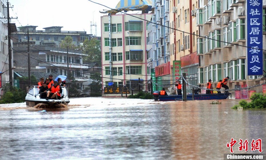 9月18日,四川巴中市境内普降暴雨,造成了巴河水位上涨约10米,超过警戒水位。巴州区曾口镇洪水漫过街道,造成大量民众被困,受灾严重。截止18日晚间19时许,巴中市消防、民兵、武警等已出动警力上千人次,冲锋舟50艘次,营救被困群众600余人,疏散转移民众千余人。图为巴中市巴州区曾口镇水淹街道。中新社发 曹双友 摄