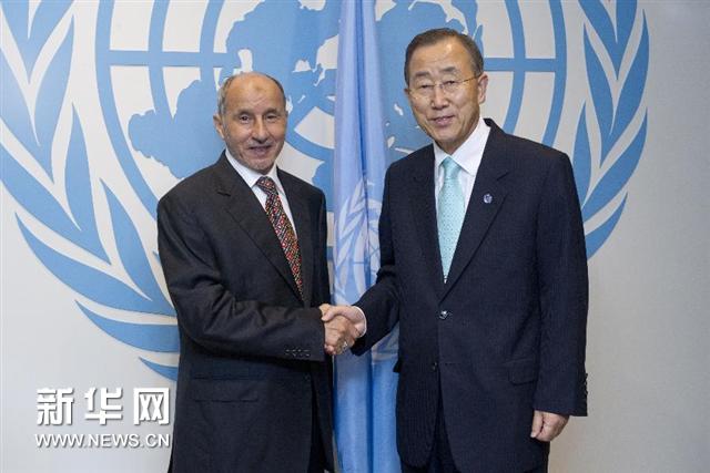 9月20日,联合国秘书长潘基文(右)在美国纽约联合国总部会见利比亚“全国过渡委员会”主席贾利勒。第66届联合国大会9月16日批准利比亚“全国过渡委员会”为利比亚在联合国的合法代表。 新华社发(联合国提供/埃文·施奈德摄)