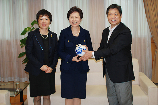 图为拜访香港发展局局长林郑月娥(中)