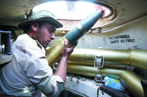 9月27日,在距离利比亚首都的黎波里175公里的拜尼沃利德,一名利比亚执政当局武装人员在坦克里安装炮弹。新华社发