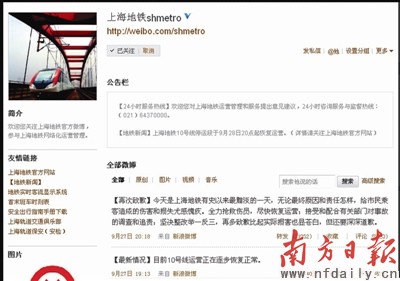 自媒体时代,上海地铁事故不可避免地成了两天来微博上最热门的话题。截至昨晚18时30分,记者在新浪微博上搜索“上海地铁事故”,共搜出644123条微博。@上海地铁shmetro在很大程度上成了网友的首要消息源。许多网友对此次@上海地铁shmetro的表现颇为满意,“感到了一种人性化的新鲜感”,尤其是“多次的感谢和致歉”。