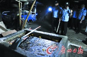 前日,南海警方展开行动,出动多名警员在辖区养殖场所排查地沟油黑作坊,仅在一窝点查获疑似地沟油两桶。前晚9时许南海警方更是出动60余名警员,本报记者跟随警方来到松夏工业园附近养殖场,发现多处养殖场收集处理潲水不规范,但并未发现有关成品地沟油及其流向的证据。警方表示,将密切关注辖区内偏僻地区养殖场情况,一旦发现地沟油黑作坊,将予以严查。