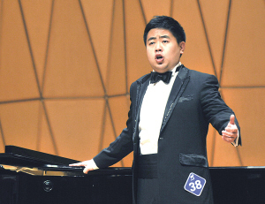 昨天是初赛第三场,在参赛的10名选手中,吕志强是第8位上场。穿着黑色礼服、系着黑色蝴蝶结的他用那抒情男高音嘹亮高亢的嗓音深情演唱了3首曲目,另两首是R·施特劳斯的《奉献》中“是的,你知道,亲爱的人”和威尔第《弄臣》中的公爵咏叹调“我看见她哭泣”。对于自己所选择的歌曲,吕志强透露:“这些古典曲目是按组委会要求选的‘规定动作’。像这首莫扎特的咏叹调,反复的高音顺流直下,最后在和谐气氛中结束,难度系数高,而这首《奉献》大家耳熟能详,也是我个人很喜欢的。”