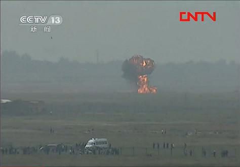 人民网渭南10月14日电 今日上午10时,中国国际通用航空大会航空表演开始。在外国表演队表演完成之后,一架国产“飞豹”战斗轰炸机在进行巡场表演之后坠入跑道西侧空地。
