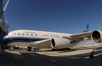 2011年10月17日,在北京首都国际机场的2号航站楼,南航A380大型客机远航飞往广州。至10月26日,A380北京-广州往返航线头等舱的平均客座率已经分别达到85%和83%,23日前北京-广州往返航班全部座位基本销售完毕。