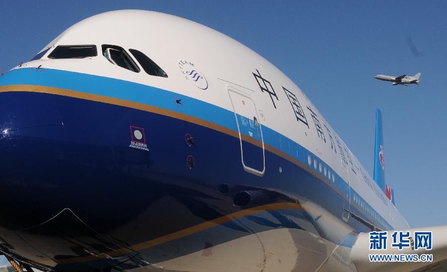 10月13日,一架即将交付中国南方航空公司的空客A380停在法国图卢兹的机场上。空中客车公司定于10月14日向中国南方航空公司交付首架A380飞机。南航将成为中国首家、全球第七家运营空客A380的航空公司。新华社发