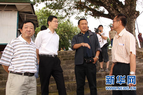 10月17日,中国政府联合工作组组长、外交部领事司副司长兼领事保护中心主任郭少春(左二)与泰国警察总署负责刑侦事务的副总监披西(右二)就中国船员在湄公河遇袭身亡事件进行交谈。当天,由中国外交部、公安部、交通运输部组成的中国政府联合工作组对中国船只在湄公河遇袭的事发水域现场进行了勘察。 新华社记者 黎藜摄
