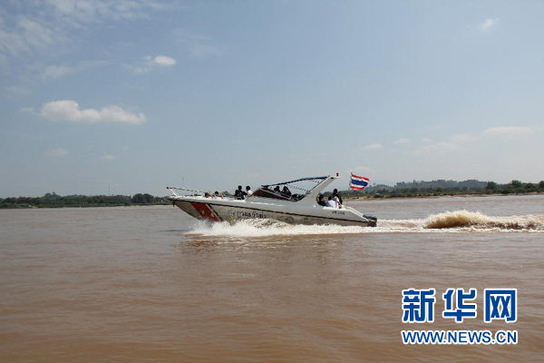 10月17日,中国政府联合工作组成员乘坐泰国警方快艇,对中国船员在湄公河遇袭身亡事件事发水域进行勘察。新华社记者 黎藜摄