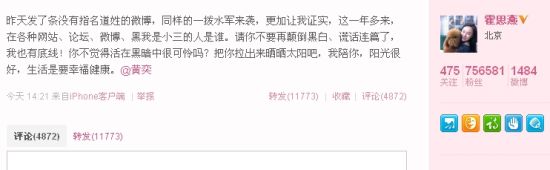今天霍思燕在微博上索性指出了该怨妇型女星就是黄奕的事实,并在微博向黄奕“宣战”,把她拉出来晒晒太阳。这样的举动令网友们很吃惊,娱乐圈中明星们很少愿意指名道姓,将纠纷公开化。霍思燕可谓第一人,她于14点21分在微博中写道:“昨天发了条没有指名道姓的微博,同样的一拨水军来袭,更加让我证实,这一年多来,在各种网站、论坛、微博、黑我是小三的人是谁。请你不要再颠倒黑白、谎话连篇了,我也有底线!你不觉得活在黑暗中很可怜吗?把你拉出来晒晒太阳吧,我陪你,阳光很好,生活是要幸福健康。@黄奕”