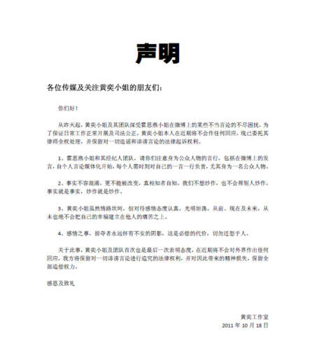 从昨天起,黄奕小姐及其团队深受霍思燕小姐在微博上的某些不当言论的不尽困扰,为了保证日常工作正常开展及司法公正,黄奕小姐本人在近期将不会作任何回应,现已委托其律师全权处理,并保留对一切造谣和诽谤言论的法律起诉权利。