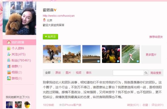 霍思燕微博表态:纵然身陷囹圄也不悔