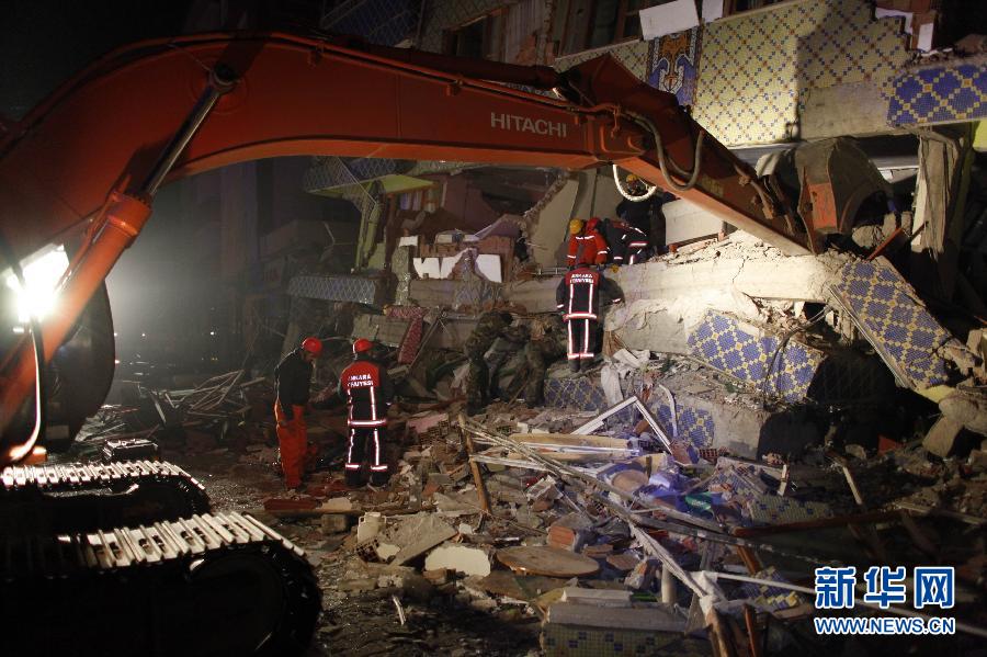 10月24日,在土耳其东部凡省埃尔吉斯,救援人员在废墟中寻找生还者。