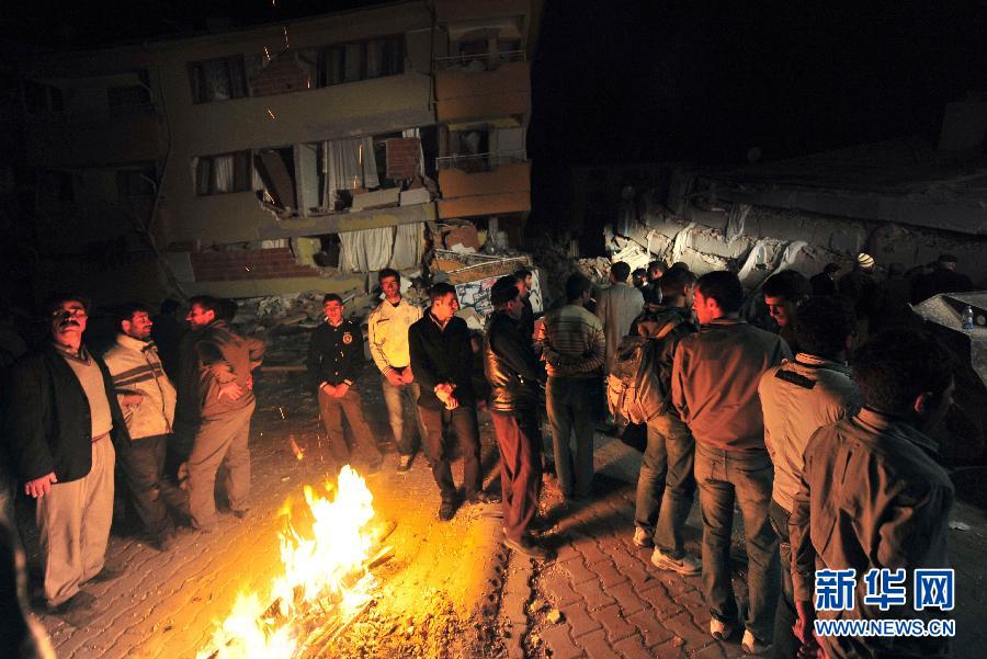 10月23日,在土耳其东部凡省埃尔吉斯,当地民众站在废墟旁的火堆边。土耳其总理埃尔多安23日说,到目前为止,土耳其东部凡省发生的强烈地震已经造成138人死亡、350人受伤。据土耳其伊斯坦布尔地震研究中心报告,当地时间23日13时41分(北京时间18时41分),凡省发生里氏7.2级地震,震中位于和伊朗接壤的凡省塔巴利村,震源深度5公里。新华社/法新