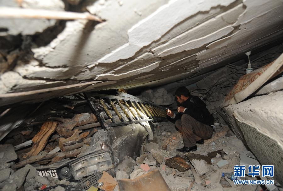 10月23日,在土耳其东部凡省地震灾区,一名男子在废墟内查看被压坏的车子。土耳其伊斯坦布尔地震研究中心已将凡省当天发生的地震级别由先前公布的里氏6.6级上调为里氏7.2级,并估计此次地震可能造成数百人死亡。新华社/阿纳多卢通讯社