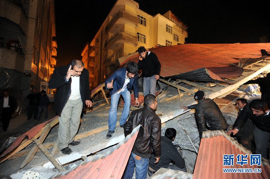 10月23日,在土耳其东部凡省地震灾区,当地居民继续搜救工作。土耳其伊斯坦布尔地震研究中心已将凡省当天发生的地震级别由先前公布的里氏6.6级上调为里氏7.2级,并估计此次地震可能造成数百人死亡。新华社/阿纳多卢通讯社