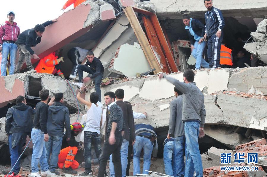10月23日,在土耳其东部凡省,搜救队和当地民众在废墟中搜索。土耳其伊斯坦布尔地震研究中心23日将东部凡省当天发生的地震级别由先前公布的里氏6.6级上调为里氏7.2级,并估计此次地震可能造成数百人死亡。新华社/阿纳多卢通讯社