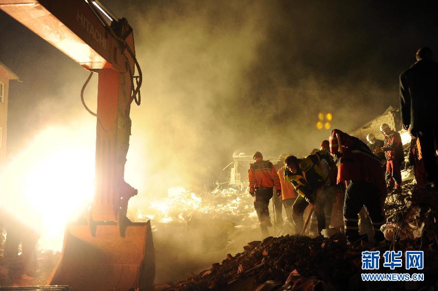 10月25日,在土耳其东部凡省埃尔吉斯,救援人员冒雨在废墟中寻找生还者。当日,土耳其东部凡省23日发生的强烈地震造成的死亡人数已上升至459人,另有1352人受伤。凡省当日下午开始下雨,给搜救工作带来极大的困难,但搜救人员仍然争分夺秒的工作,竭尽全力找寻生命迹象。新华社记者马研摄