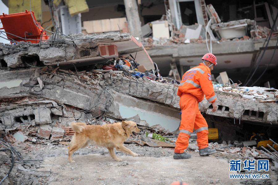 10月25日,在土耳其东部凡省埃尔吉斯,救援人员带领侦察犬在废墟中寻找生还者。当日,土耳其东部凡省23日发生的强烈地震造成的死亡人数已上升至459人,另有1352人受伤。凡省当日下午开始下雨,给搜救工作带来极大的困难,但搜救人员仍然争分夺秒的工作,竭尽全力找寻生命迹象。新华社记者马研摄