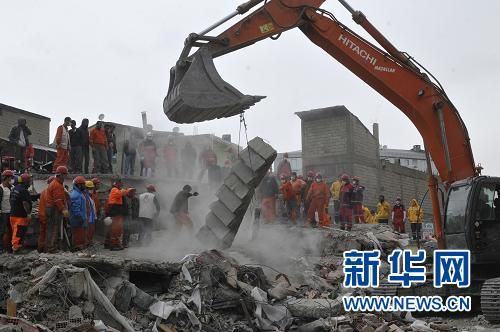 10月24日,在土耳其东部凡省,救援队用铲土机清理废墟。 新华社/阿纳多卢通讯社