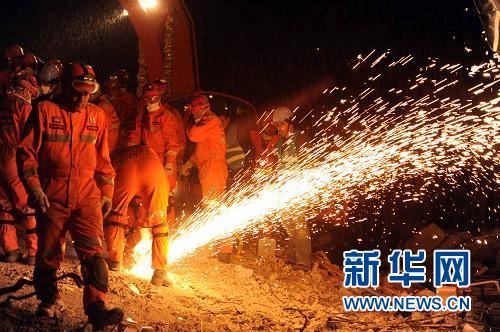 10月26日,在土耳其东部凡省埃尔吉斯,救援人员用电锯锯断废墟中钢筋。 新华社记者马研摄