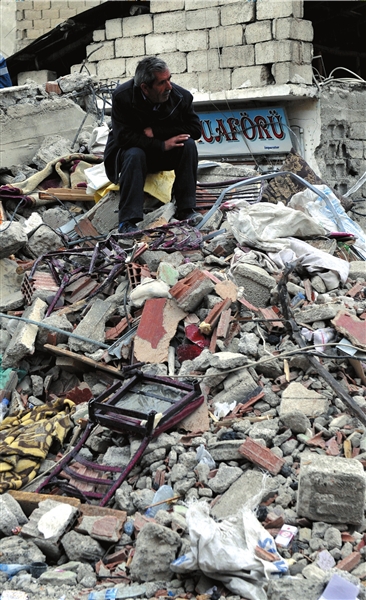 10月25日,在土耳其东部凡省,一名土耳其老人坐在废墟堆上。新华社发
