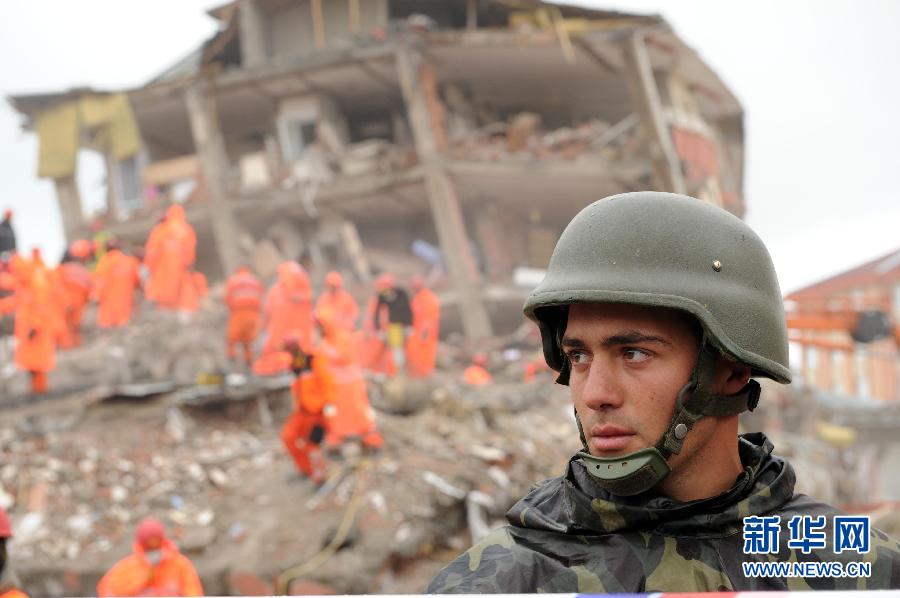 10月27日,在土耳其东部凡省埃尔吉斯,一名士兵在地震灾区执勤。当晚,土耳其总理府发表声明说,土耳其东部凡省23日发生的强烈地震造成的死亡人数已上升到550人。目前,救援队已从废墟中成功救出185人。新华社记者马研摄