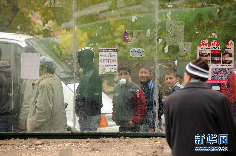 10月27日,在土耳其东部凡省埃尔吉斯,居民们排队领取救援物资。当晚,土耳其总理府发表声明说,土耳其东部凡省23日发生的强烈地震造成的死亡人数已上升到550人。目前,救援队已从废墟中成功救出185人。新华社记者马研摄