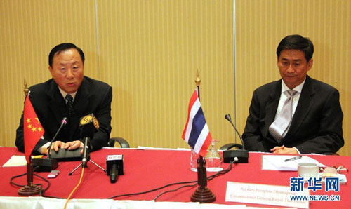 10月28日,中国公安部副部长张新枫(左)与泰国警察总监飘潘在泰国曼谷举行会谈。中国公安部副部长张新枫当天下午与泰国警察总监飘潘会面后说,湄公河中国船员遇害案已基本告破,9名犯罪嫌疑人已到案。 新华社记者黎藜摄