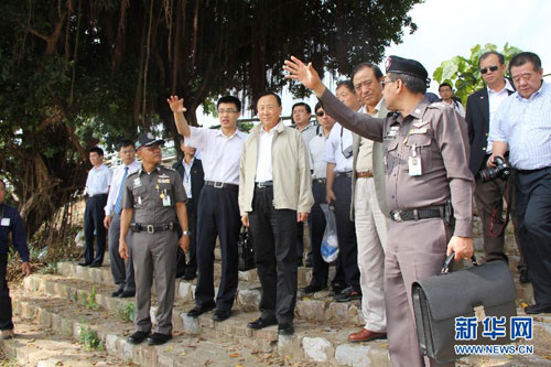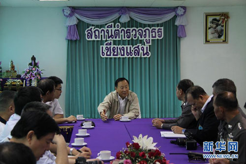 10月26日,中国公安部副部长张新枫听取泰国清盛县警方对案情的介绍。当天上午,中国公安代表团来到泰国北部清莱府清盛县,实地查看了“10·5”湄公河中国船员遇袭事件案发现场。 新华社记者黎藜摄