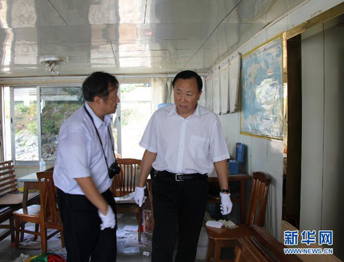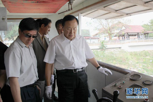 10月26日,在泰国清盛县,中国公安部副部长张新枫(左)在“华平号”货船上查看案发现场。当天上午,中国公安代表团来到泰国北部清莱府清盛县,实地查看了“10·5”湄公河中国船员遇袭事件案发现场。 新华社记者黎藜摄