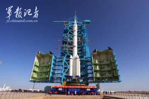 10月26日,执行我国首次空间交会对接任务的神舟八号飞船、长征二号F遥八运载火箭垂直转运至发射塔架,飞船发射进入倒计时。丁述成 马威武 中国军网记者频道记者 张晓祺 摄