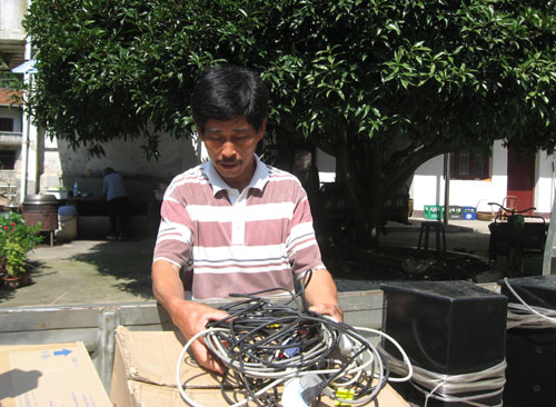 每天傍晚胡美兴都会整理好一切器材和妻子一起到各村去放电影,这样的日子,夫妻俩已经坚持了一年多。其实胡美兴真正的身份是黄坛镇榧坑村护林员,在这个工作岗位上他已经坚守了10多年。这10多年来双峰这个偏远山区文化娱乐的缺少也深深印在了胡美兴的心里,因此,每晚载着投影机,拉着音响,老胡倒贴油钱活跃于双峰各村轮流播放红色经典影片。横坑、逐步、澄深……每个村子都留有他的足迹,大家都亲切地称呼他为“远教哥”。在初识农村党员干部远程教育系统后便产生了浓厚兴趣,后来更主动成为一名远教志愿者。刚开始,不会下载影片,老胡就使上了笨办法,先在电脑上放一遍,方便保留影像。他学电脑入门后,他还自费购买8G容量的U盘,一心一意把免费远教当成正事来办。去年以来,老胡已连续播映了80多夜,往往是下午5点吃完晚饭就出发,常要放到半夜11点才能回家。遇着风大时,要用竹竿撑着银幕;遇着雷阵雨,等把机器盖好防水布,自己往往淋透了。特别是夏天,为了使机器不发热,用电风扇对着机器吹,自己宁可买盒蚊香对付。