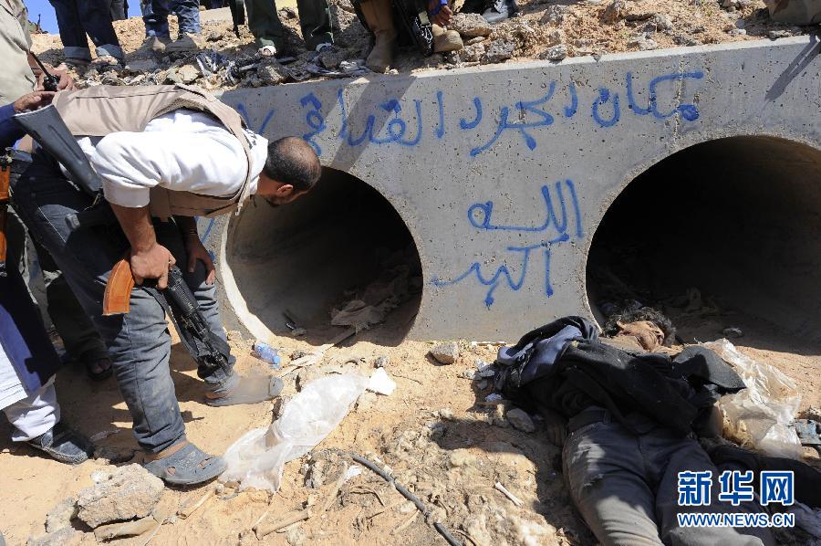 10月20日,利比亚执政当局武装人员在利比亚苏尔特观察据称是卡扎菲被逮捕时躲藏的水泥洞。利比亚“全国过渡委员会”执行委员会主席贾布里勒10月20日在新闻发布会上证实,卡扎菲当天在苏尔特身亡。 新华社/法新