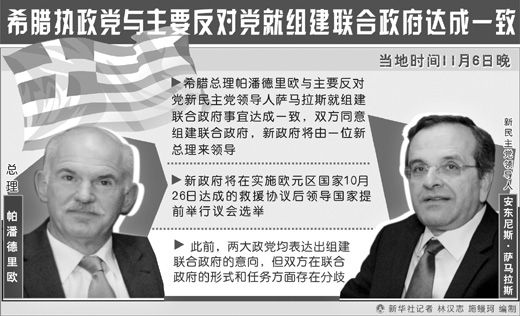 当地时间11月6日晚,希腊执政党和反对党终于达成协议:现任总理帕潘德里欧辞职,双方共同组建联合政府。过渡政府总理人选有望于7日晚些时候宣布。