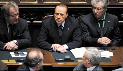 11月8日,在意大利罗马,意总理贝卢斯科尼(中)和内阁成员在众议院出席财政报告投票。新华社发