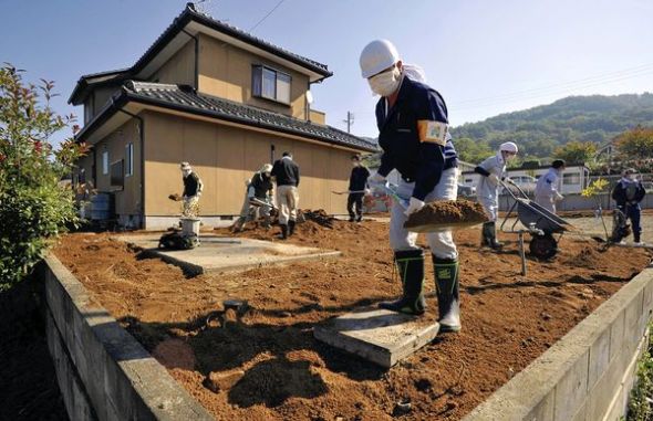 10月29日,志愿者们在福岛附近的一个家庭花园中净化土壤。福岛县是日本第四大农业区,是日本多种水果、烟草和生丝的主要产地。但是,日本厚生省于本月初发布的数据显示,福岛地区的鱼类、蘑菇和肉类标本的放射物标准仍然持续超出正常水平。日本官员近日告诉国际原子能机构专家小组,他们对于农田的目标就是在未来两年将放射性物质水平下降到50%。目前,日本方面正在进行各种实验,以找到改善土壤的最佳方法。在某地,最上层含有高浓度铯的土壤被清走,然后再种植水稻。深耕作方法也在某些地方接受试验。
