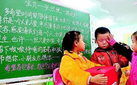 在捐款现场,托着募捐箱的一名小男孩,在大人们的议论中似乎明白了什么,刚才还说笑的他突然哭了起来,“我想张欣悦小朋友,我平时最爱和她玩了。”这个叫王世森的小男孩问妈妈:“张欣悦是不是以后再也不能和我玩了?我想她。”
