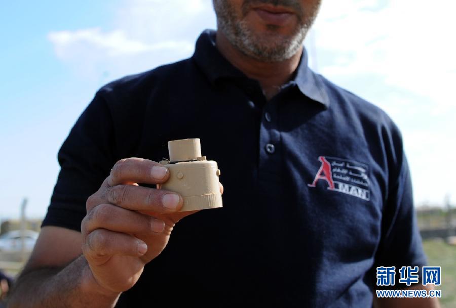 11月16日,在利比亚首都的黎波里马迪加机场附近,工作人员展示一枚已拆除的地雷。马迪加机场近日发现万余枚卡扎菲军队布设的地雷,排雷工作目前正在紧张进行中。新华社记者覃海石摄