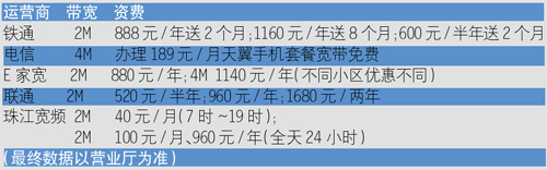 就这一问题记者多次采访广东电信,然而至今对方未作答复。与电信相对应的是,联通宽带针对普通消费者有“普通电话加装宽带”、“普通电话捆装宽带”、“单独安装宽带”等多种选择,宽带费用也有不同的档次,其中1兆带宽月租100元,2兆带宽月租120元。铁通包年2兆带宽988元送两个月,4兆包年1280元。珠江宽频的2兆产品中还有更为灵活的“阳光套餐”,上网时间为早七点至晚七点,每月只需40元。