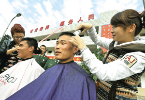 昨天上午,温州籍的温小玲(右)、温玲妹(左)两姐妹来到武警宁波市支队8中队,为即将退伍的老兵理发。两姐妹自1998年在望春街道开办美发店后,就与该中队结对,姐妹俩每月都到警营为战士们理发,许多战士还因此学会了理发。