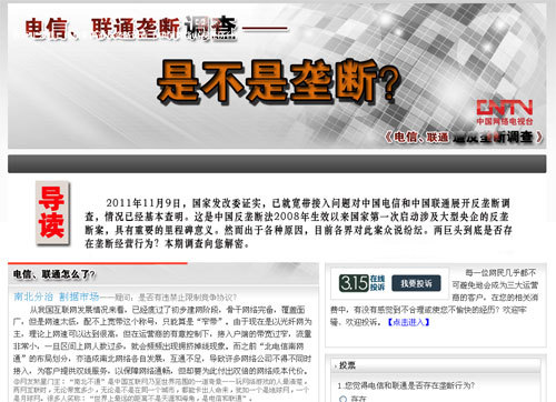 图片为中国网络电视台有关电信联通垄断调查一事专题报道截屏