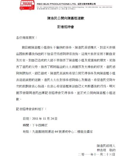 就日前陈嘉桓小姐发生不愉快的事件,陈浩民深感愧疚,对当天在横店因他醉酒后作出的不恰当行为感到非常后悔。这几天他在家里不断自责及反省,对自己造成的大错不单伤害了陈嘉桓小姐及爱护她的朋友,更伤害了浩民的父母、伤害了即将临盆的太太蒋丽莎及支持他的好友,浩民感到无限悔疚。错已铸成,陈浩民真诚地希望公开交待事件及向陈嘉桓小姐表达最诚恳的道歉。浩民太太也对事件感到痛心及难过,希望浩民受到今次的教训会真心悔过,也衷心希望嘉桓原谅自己丈夫醉酒后的行为。明天丽莎会陪同浩民出席记者招待会交待事件,并正式公开向陈嘉桓小姐道歉。