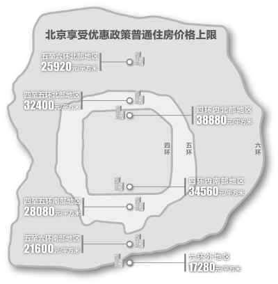 北京市上一次调整普通住房标准是在2008年11月。根据当时标准,除了“小区容积率1.0(含)以上、单套建筑面积在140(含)平方米以下”两固定项外,就价格而言,实际成交总价的上限分别为三环以内258万元,三环四环之间210万元,四环五环之间198万元,五环以外120万元。