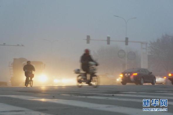 12月5日清晨,在山东聊城市街头,市民在大雾中骑车出行。当日6时,中央气象台继续发布大雾蓝色预警:预计5日早晨到上午,华北中南部、黄淮、江淮、江南、华南北部等地有轻雾,其中,京津地区、河北中南部、山东西北部、安徽南部、浙江西部、福建西部、江西、湖南西南部和东北部等地的部分地区有能见度不足1000米的雾,局部能见度不足200米。新华社发(张宪举)